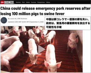 2019年9月4日の米CNNの報道より ・CNN アフリカ豚コレラという豚の感染症が中国などで発生してから、1年ほど経とうとしていますが、その猛威は収まっていません。 中国では、7月まで … 続きを読む 中国でのアフリカ豚コレラによる殺処分頭数が「1億頭」を超える