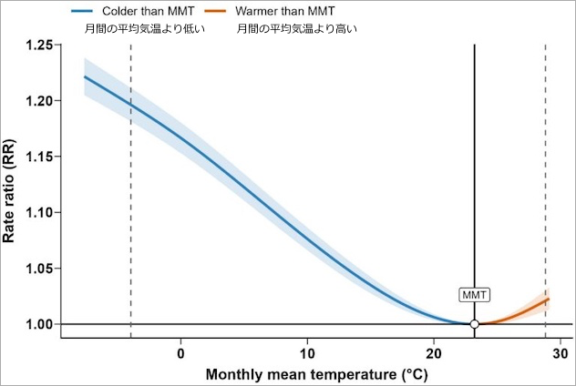 青(左)が寒さでの超過死亡率。赤(右)は暑さでの超過死亡率