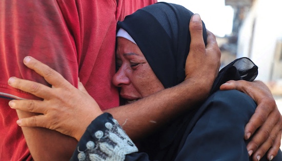 ガザ市のアル・シーファ病院で、イスラエル軍による難民キャンプへの攻撃で死亡したパレスチナ人の葬儀。