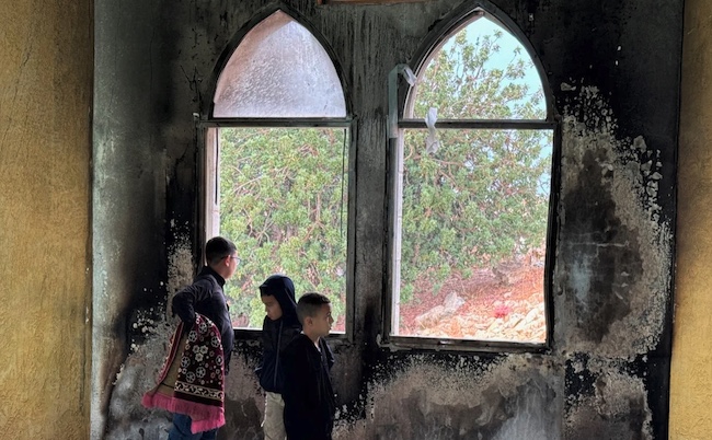 11月14日、ヨルダン川西岸地区で、イスラエル人入植者による攻撃を受けたモスクの被害を見つめるパレスチナの子どもたち。MEM