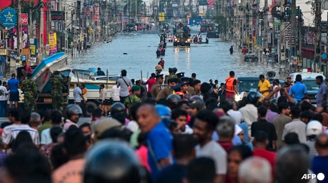 スリランカのケラニヤで起きたサイクロン・ディトワの後、浸水した道路を歩く人々。aljazeera.com