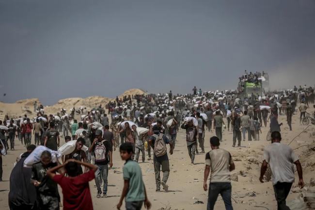 支援物資を受け取るため、ガザ北西部の支援物資配給所に集まる人々。
