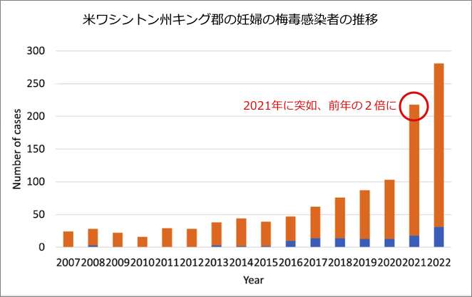 それぞれ、以前から緩慢に増え続けていたのではなく、「 2021年から急激に増えた」ことがわかります。たとえば、以下は、ワシントン州の妊婦の梅毒患者の数の推移です。