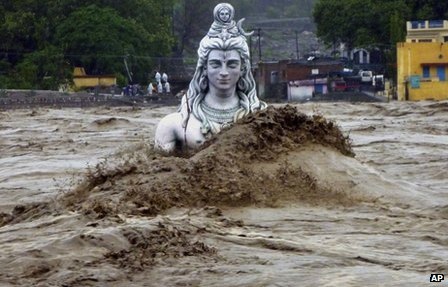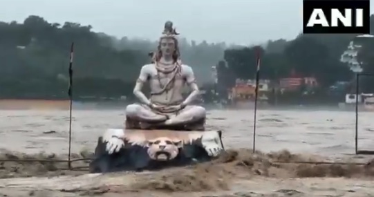 このウッタラーカンド州では、12年前の 2013年6月にも大洪水が発生したことがありますが、その時に印象的だったのは、聖地と呼ばれるリシケシという街にある「シヴァ神の巨大な像」が洪水に飲み込まれるという画像でした。以下です。