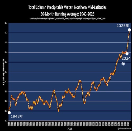 先日の「北半球の最大降水量の増加が考えられないほど増えているのは、自然の現象?」という記事でも、グラフを載せましたが、現在、北半球の雨量(全降水量)が、非常に多い状態となっていて、このような洪水が北半球のいたるところで起きる可能性があります。