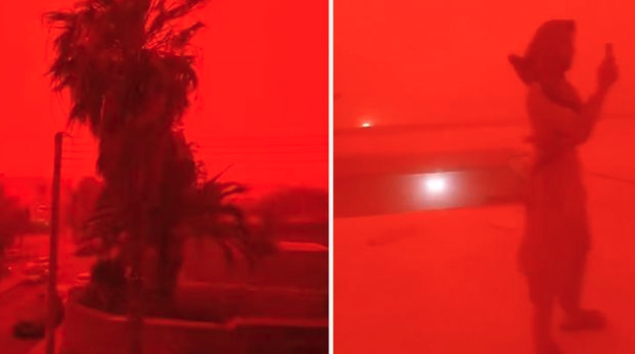 砂嵐の発生場所であると見られる北アフリカの各地も赤い大気に見舞われているようで、以下は、リビアのトブルク市の様子とのこと。